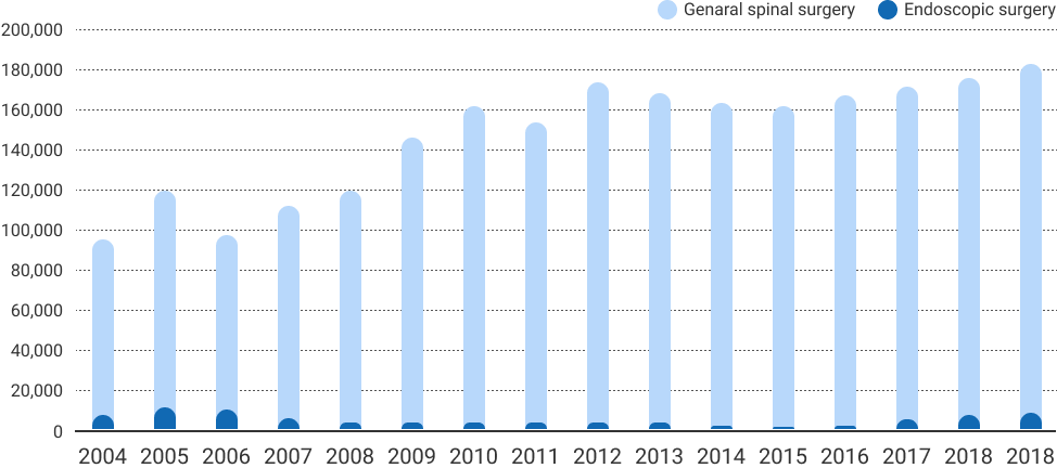 According to the main surgery statistical yearbook from Korean National Health Insurance Service, the total number ofspine surgery was increased from 92,390 in 2004 to 174,868 in 2019.