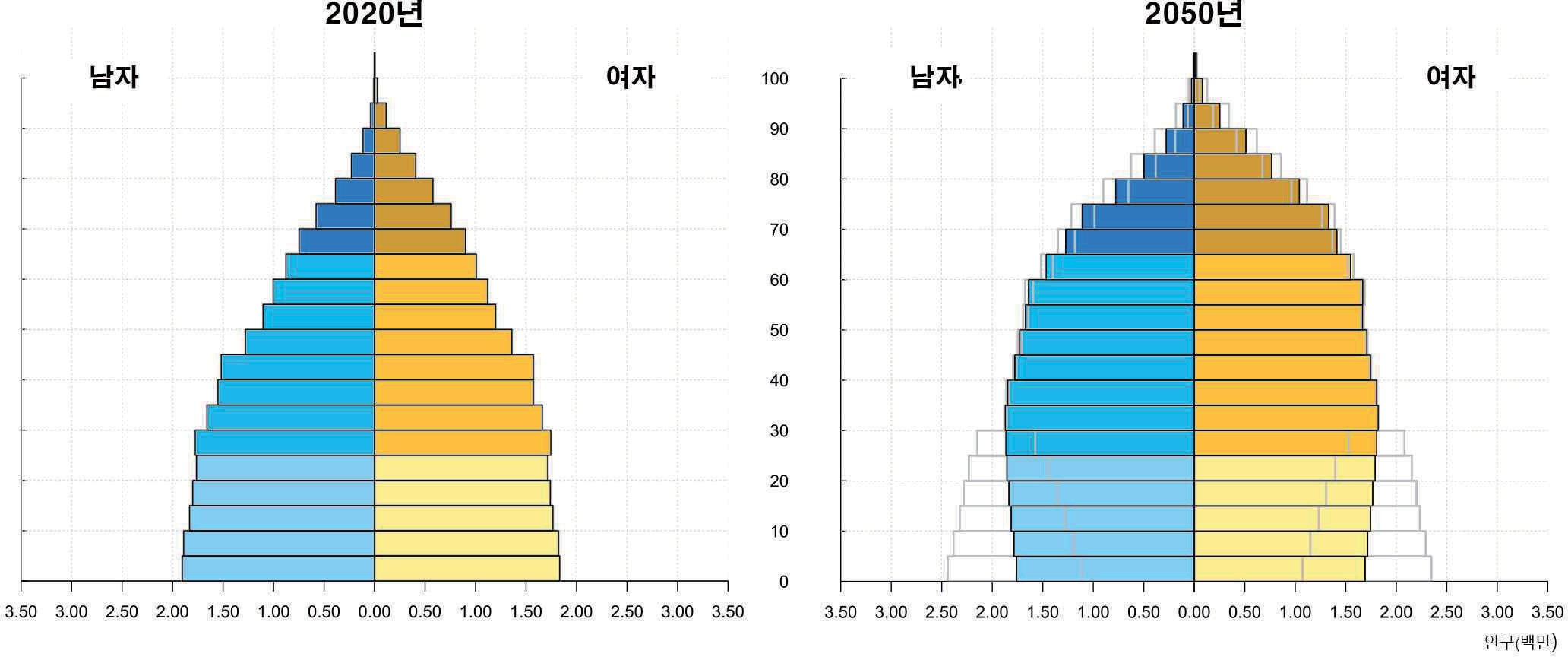 아르헨티나의 ’20년과 ’50년 인구피라미드는 다음과 같음