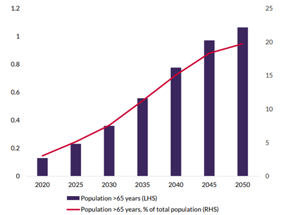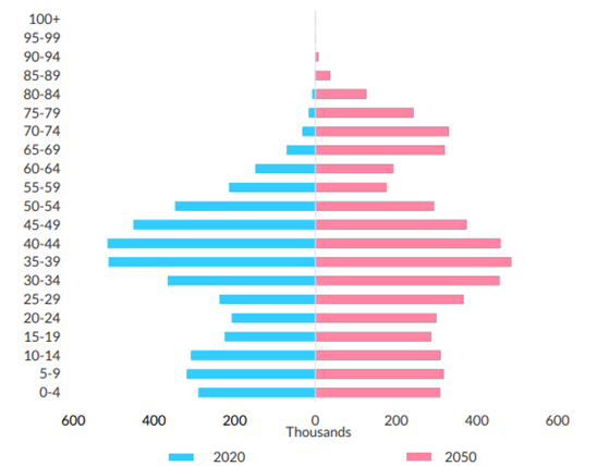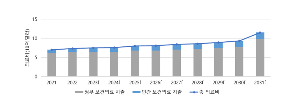 '21년 기준 인구 1,000명당 내과의사 3.15명, 간호사 8.02명, 약사 0.79명, 치과의사 0.59명으로 조사되었으며, '26년에는 내과의사 3.96명, 간호사 8.45명, 약사 0.79명, 치과의사 0.71명으로 전망됨