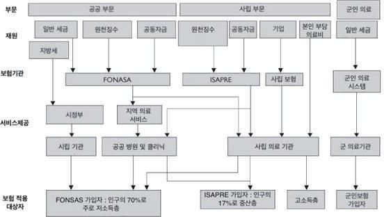 칠레의 의료체계는 크게 공공과 민간 부문으로 이원화되어 있음